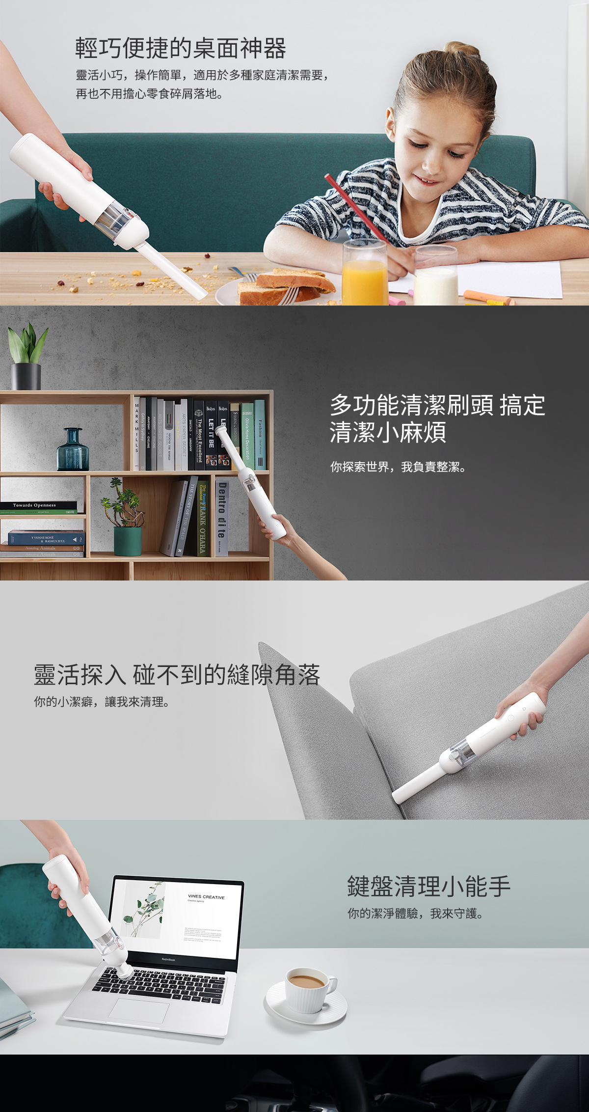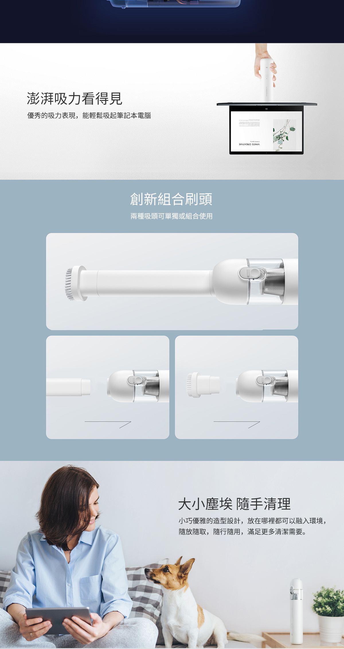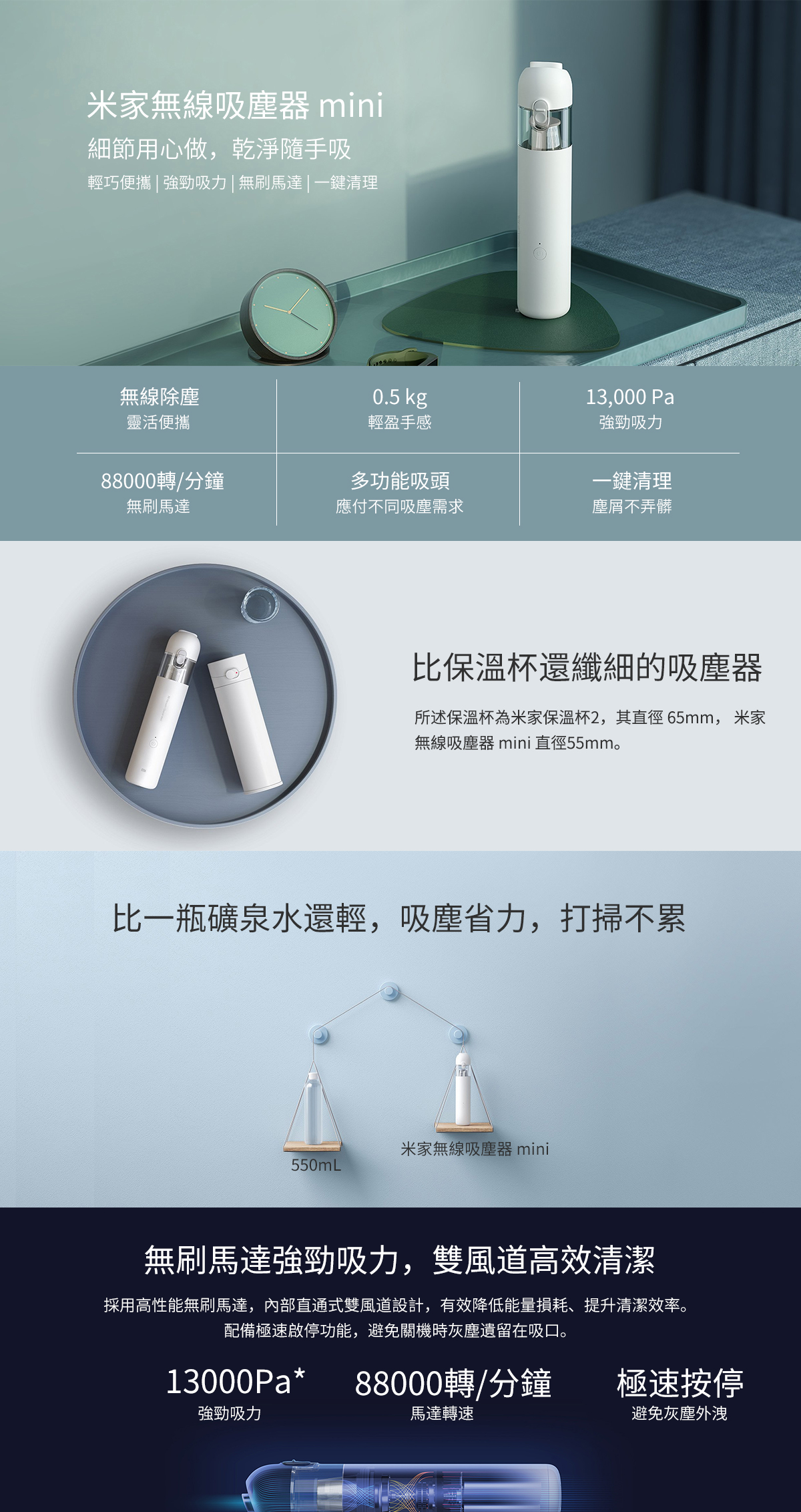 無線除塵靈活便攜 0.5 kg輕盈手感 13000 Pa強勁吸力 88000 轉/分鐘無刷馬達 多功能吸頭應付不同吸塵需求 一鍵清理塵屑不弄髒