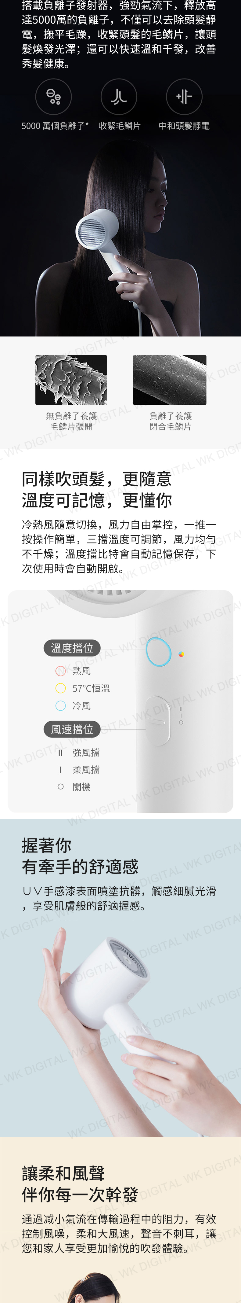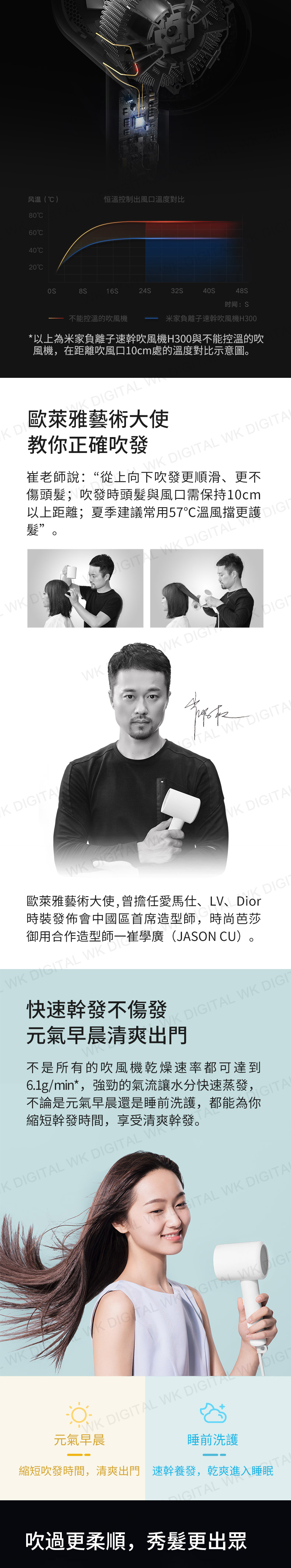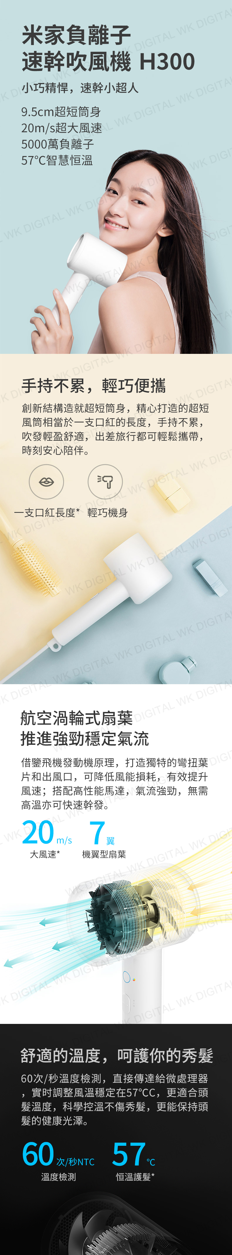米家負離子風筒H300,可釋放負離子,撫平毛躁。航空渦輪式扇葉,強勁氣流,精準溫控,快速吹乾不傷秀髮。機身輕巧,方便攜帶。 9.5 公分超短外殼 20公尺/秒超大氣流 5,000 萬個負離子 57°C 智慧溫度控制 纖巧輕便的快乾吹風機