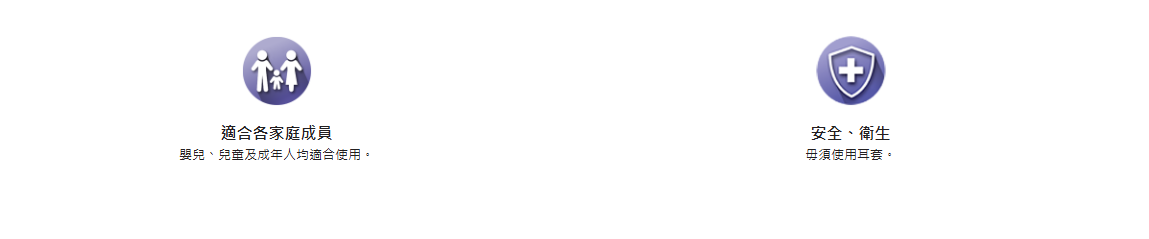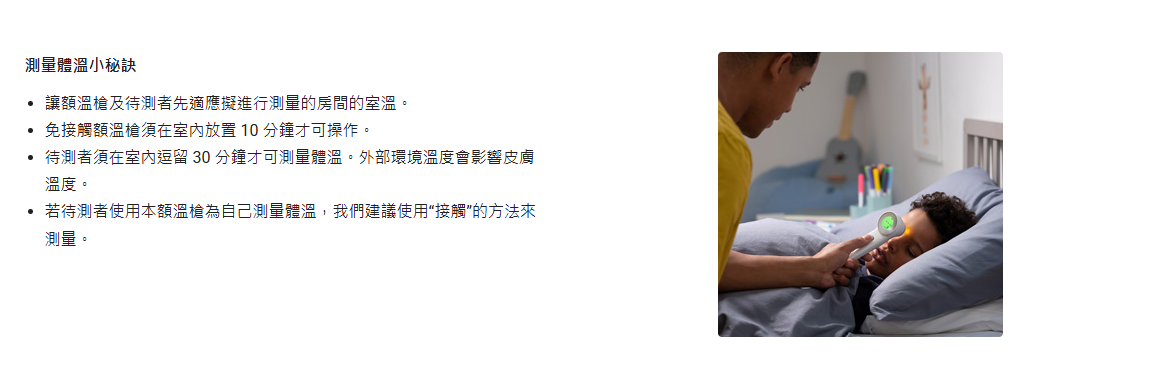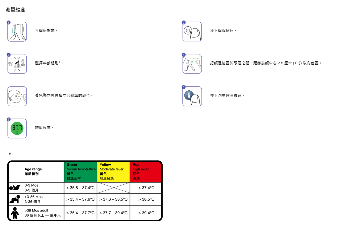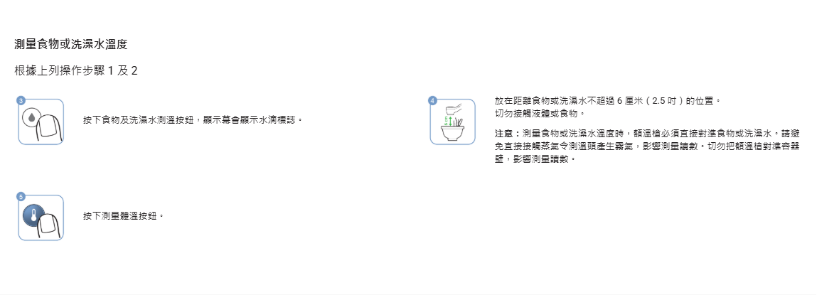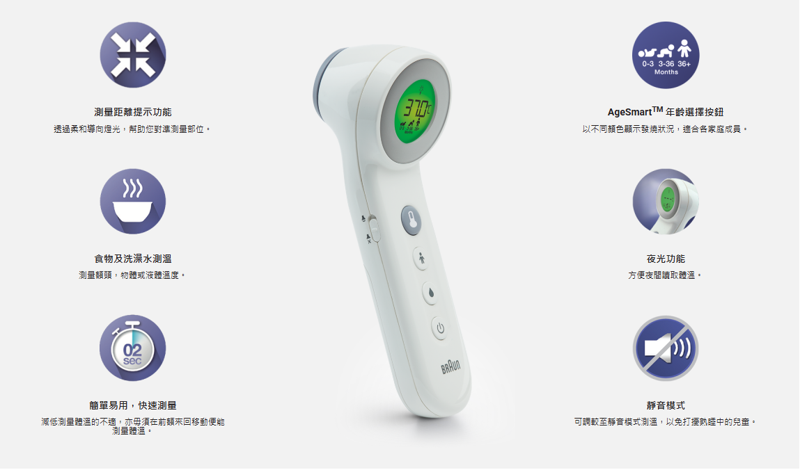 測量距離提示功能 AgeSmartTM 年齡選擇按鈕 食物及洗澡水測溫 夜光功能 簡單易用,快速測量 靜音模式 適合各家庭成員 安全、衛生