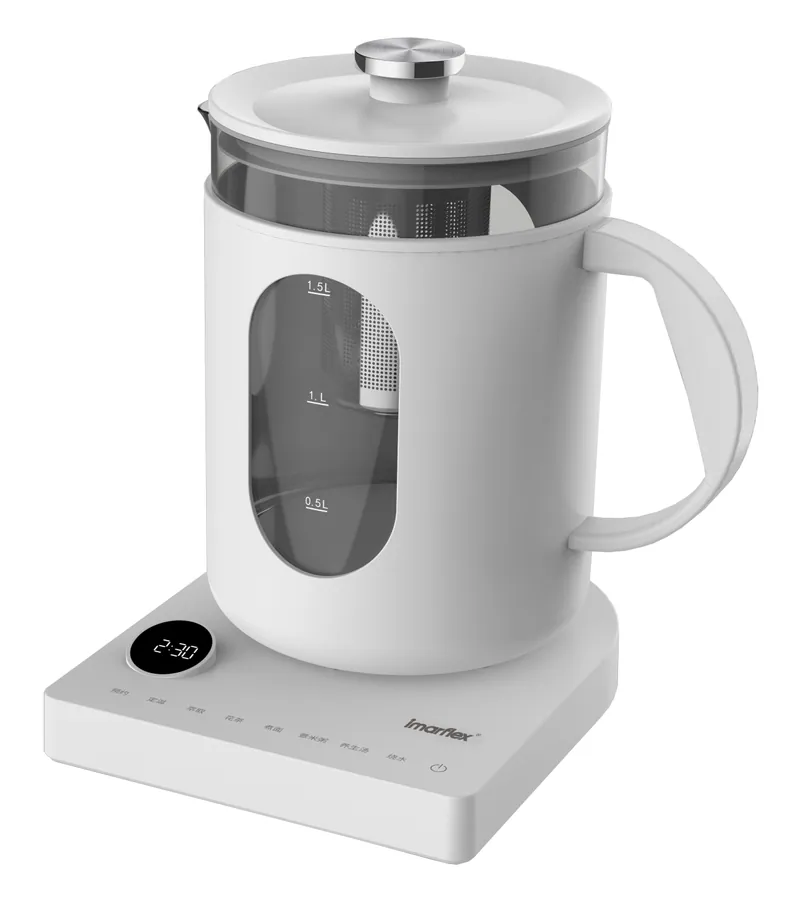 預設6種不同煮食功能;11段保溫溫度設定(45~95°C) 最大8小時時間設定;3位數碼顯示屏設計 特式透明玻璃壶身設計;304不銹平底發熟元件 具有過熱自動停止装置;分離式360°旋轉插座 產品尺寸:W163 x D204 x H238mm 最大功率: ~800W;最大容量:~1.5L 配件: 不銹鋼濾網