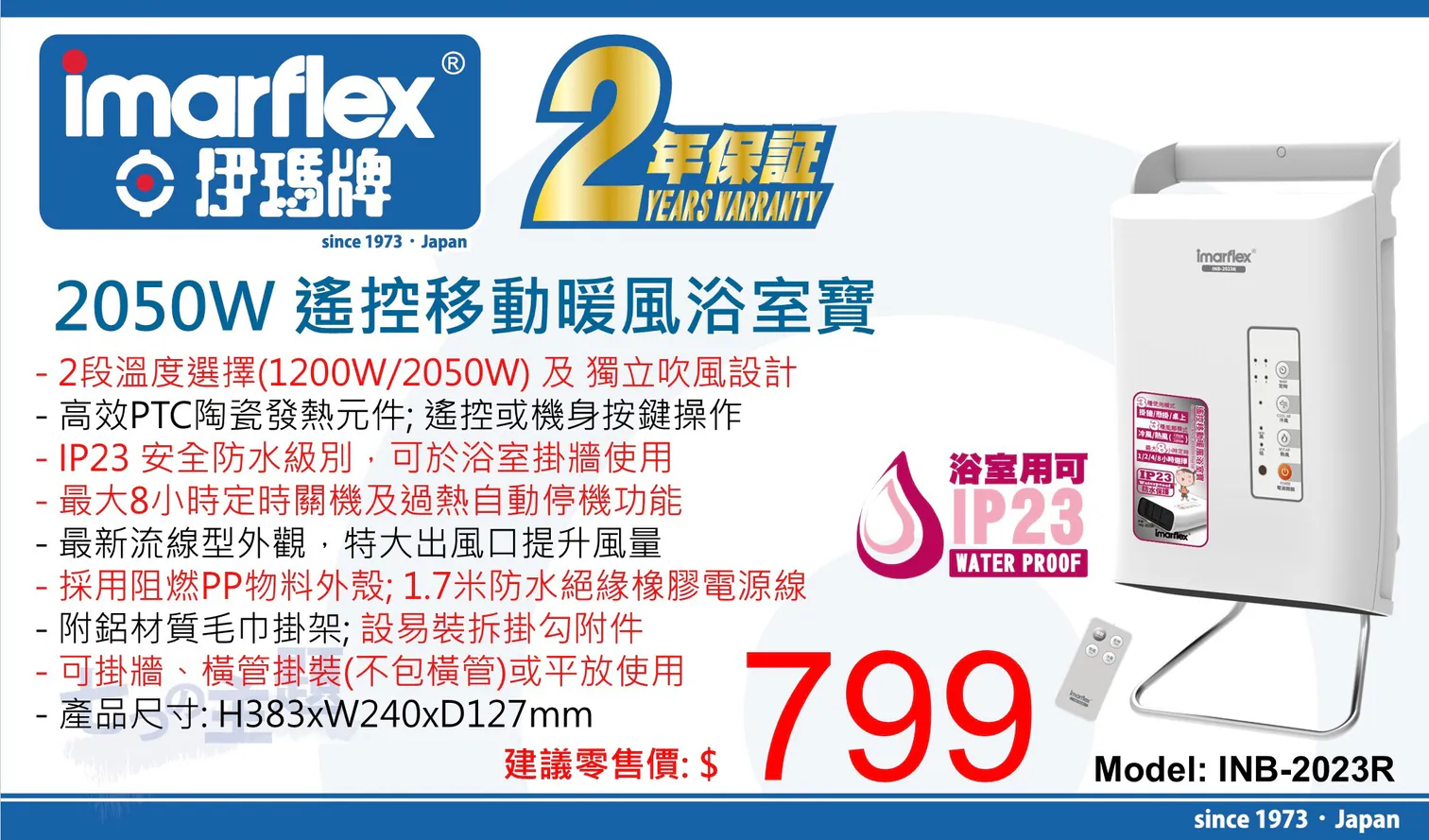 Imarflex 伊瑪牌 遙控移動暖風浴室寶 INB-2023R丨香港行貨