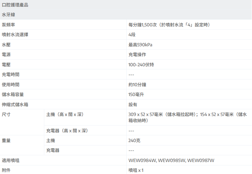 脈衝式高速噴射水流,每分鐘高達1,500次*,徹底清潔難刷部位,有效去除食物殘渣,保持口腔清潔(* 於噴射水流「4」設定時)4段噴射水流選擇,配合旋轉式噴射噴咀,有效清潔牙縫、牙周袋及按摩牙齦伸縮式儲水箱及噴咀隱藏儲存位置,方便攜帶外遊可拆式水箱,方便儲水及清洗全機防水設計RC 100-240伏特 (世界通用電壓)顏色:白噴咀:WEW0987W產地:中國