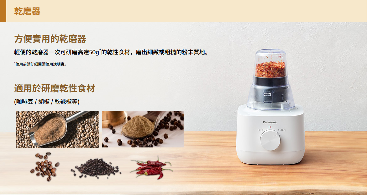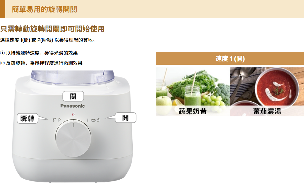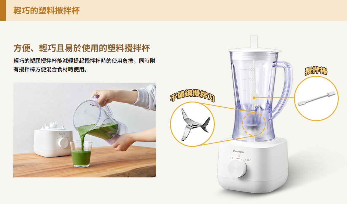 容量:1.0 公升 (塑膠容器)400瓦特 (最大鎖定摩打瓦特)旋轉開關具備瞬轉模式附乾磨器,可磨碎乾性食材 (如咖啡豆、胡椒、香料等)安全鎖定裝置,確保產品於攪拌容器或乾磨器未安裝正確時不能開動過熱和過負載保護裝置,防止馬達過熱鋒利耐用的刀片顏色:白中國製造