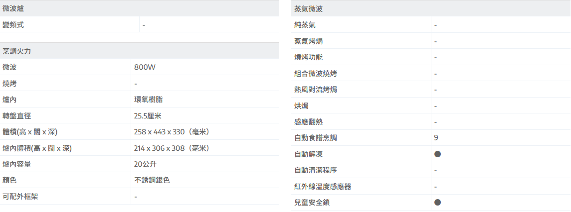 容量:20公升5段微波火力調校,最大烹調火力800瓦特可連續設定最多3段微波火力進行烹調內置9款自動程式:3款自動解凍、3款自動翻熱及3款自動烹調快速翻熱功能轉盤直徑:25.5厘米烹調時間及放置時間預約旋鈕及按鈕式操作兒童安全鎖顏色 : 不銹鋼銀色體積(高 x 闊 x 深):258 x 443 x 330 (毫米)產地: 中國
