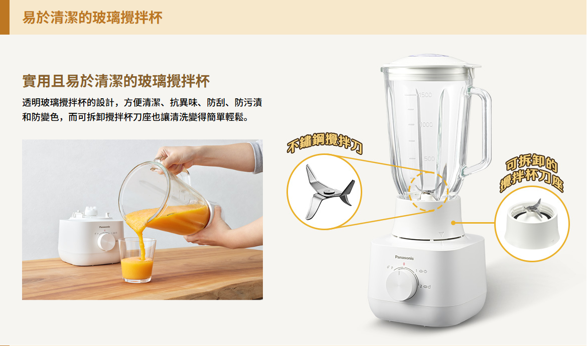 容量:1.5 公升 (玻璃容器)450瓦特 (最大鎖定摩打瓦特)旋轉開關具備兩段攪拌速度及瞬轉模式附乾磨器,可磨碎乾性食材 (如咖啡豆、胡椒、香料等)安全鎖定裝置,確保產品於攪拌容器或乾磨器未安裝正確時不能開動過熱和過負載保護裝置,防止馬達過熱鋒利耐用的刀片可拆式攪拌刀座,方便清洗顏色:白