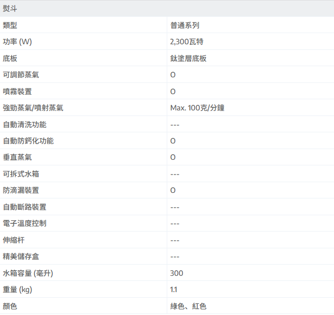 1,930 - 2,300瓦特 ﹝220-240伏特﹞乾式/噴霧/蒸氣/垂直蒸氣/噴射蒸氣強勁蒸氣輸出量︰每分鐘100克鈦塗層底板特有U形蒸氣循環底板,除縐效果更佳加闊底板,使用更方便快捷自動防鈣化功能人體工學設計把手防滴漏裝置特大水箱容量(300毫升)顏色:紅色、綠色產地︰中國