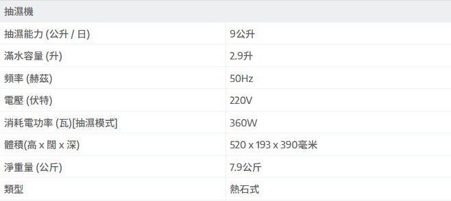 - 抽濕量:9公升/日 (廠方標準:溫度27℃,濕度80%)