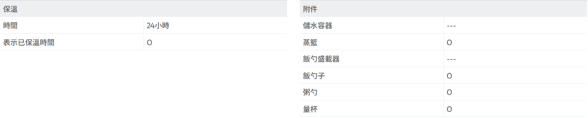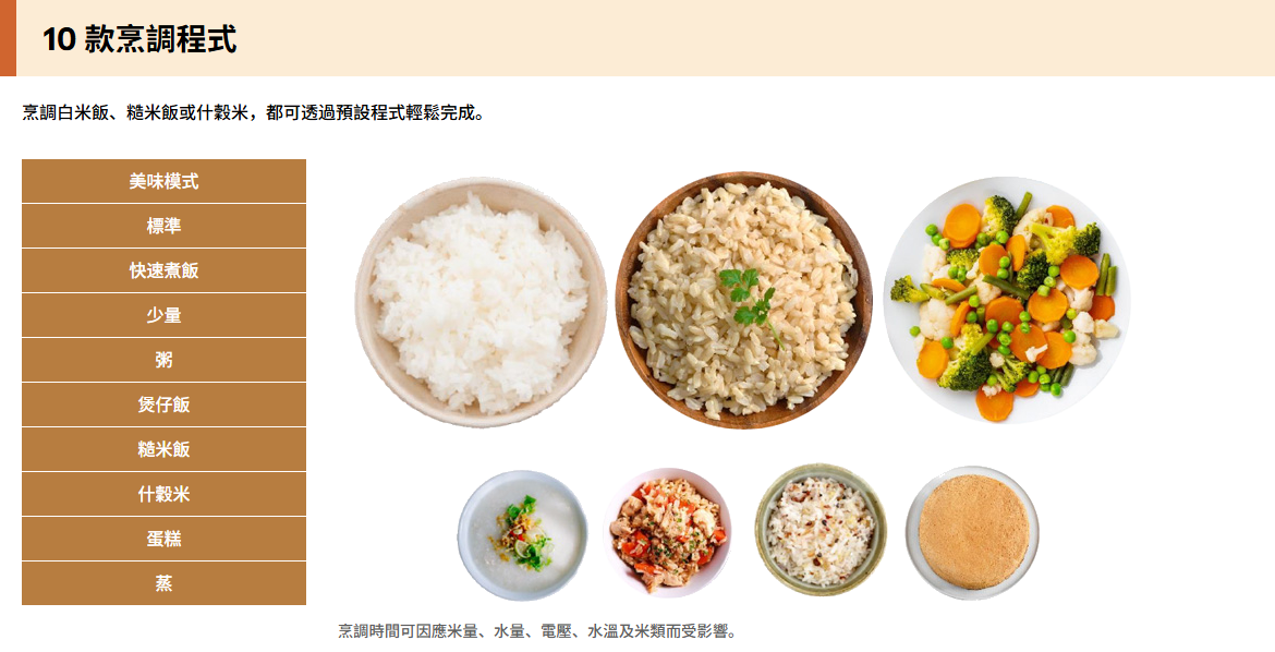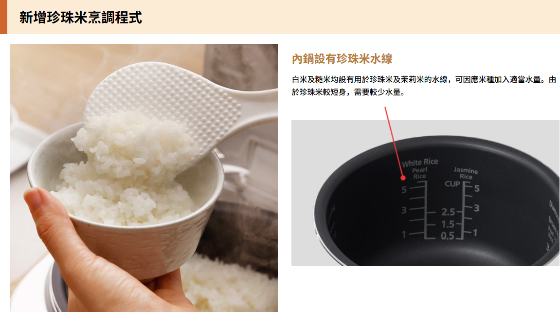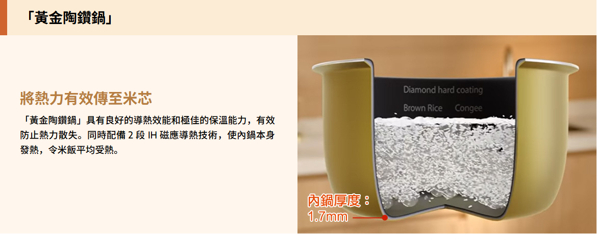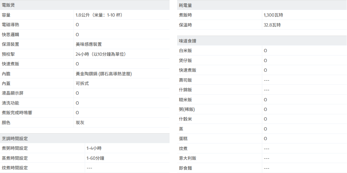 產品概覽容量:1.8公升(米量:1-10杯)2段IH磁應導熱,使內鍋本身發熱,令米飯平均受熱「黃金陶鑽鍋」備有「鑽石高導熱塗層」,產生大量細小對流氣泡,將熱力傳送至每粒米飯採用快思邏輯技術烹調程式:珍珠米/茉莉米(美味模式、標準、快速煮飯、少量)、粥、糙米飯、什穀米、煲仔飯、蛋糕及蒸煮24小時烹調時間預約24小時保溫功能可直接於內鍋洗米可拆式內蓋,方便清洗美味感應裝置附件:蒸籃、飯勺、粥勺及量杯1,300瓦特顏色:炭灰日本製造5年保用