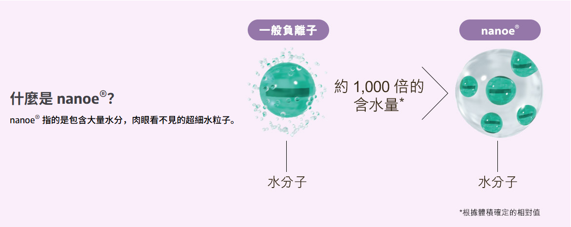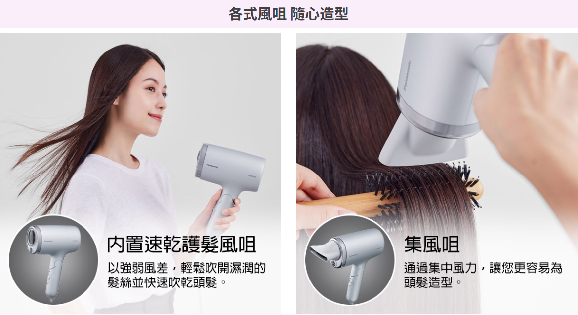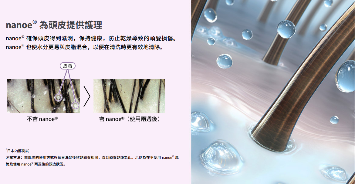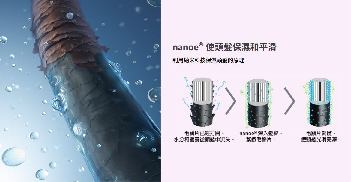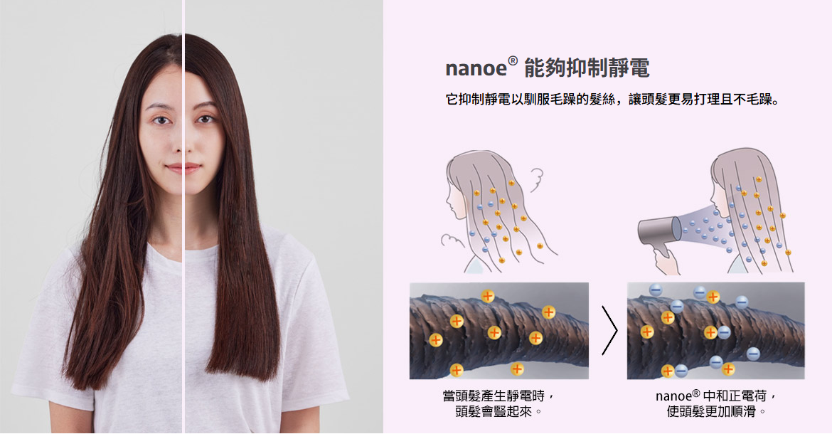 - nanoe®納米離子科技(含水量比負離子高出約1,000倍),配合nanoe®納米離子感應板,有效讓離子吸附在頭髮上,令水份更易滲透髮芯