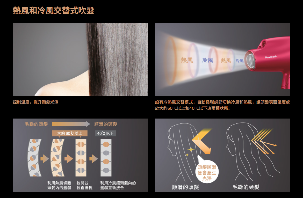 - 冷熱交替模式,能調節頭髮表面溫度避免過熱,保護髮絲自然弧度、柔順及光澤