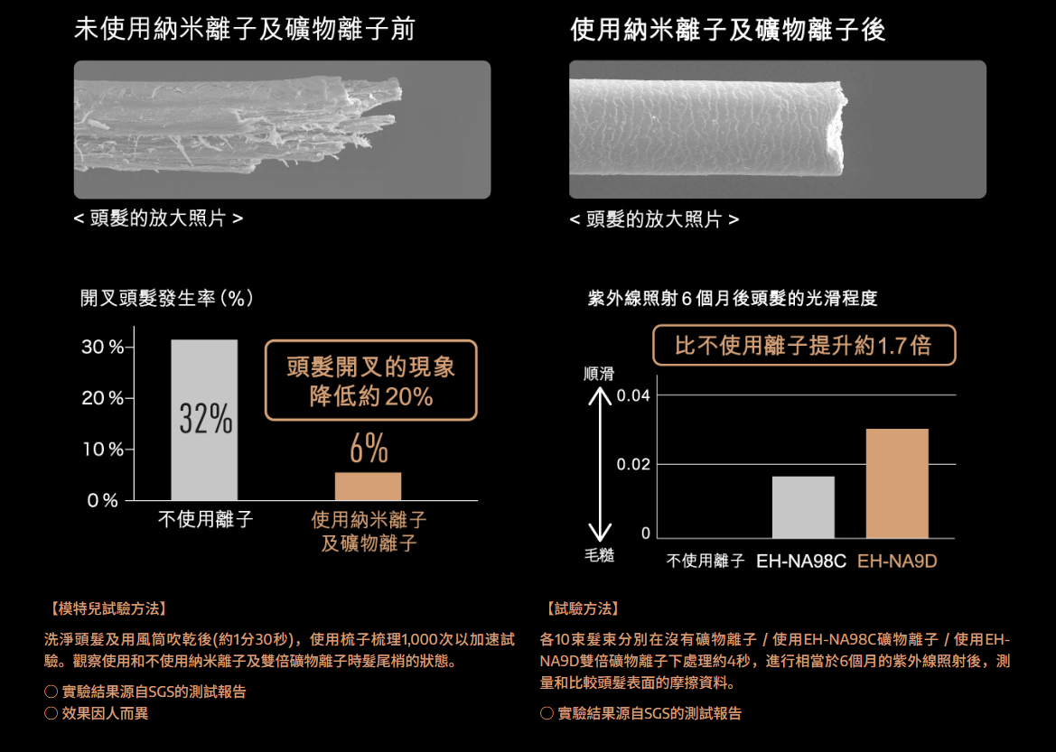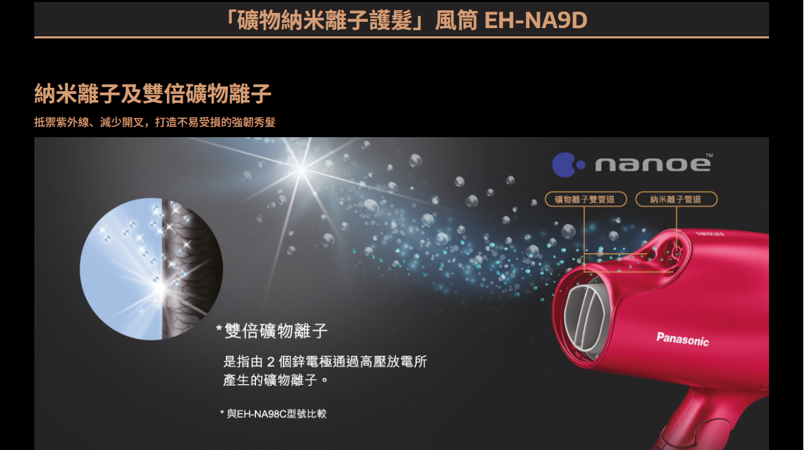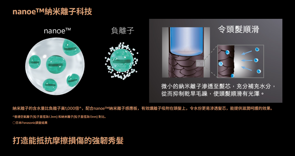 - nanoe®納米離子科技(含水量比負離子高出約1,000倍),配合nanoe®納米離子感應板,有效讓離子吸附在頭髮上,令水份更易滲透髮芯