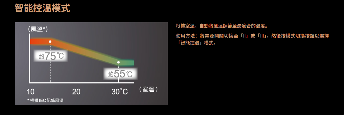 - 智能控溫模式,能偵測周圍氣溫,自動調節合適吹髮溫度,呵護秀髮免受傷害