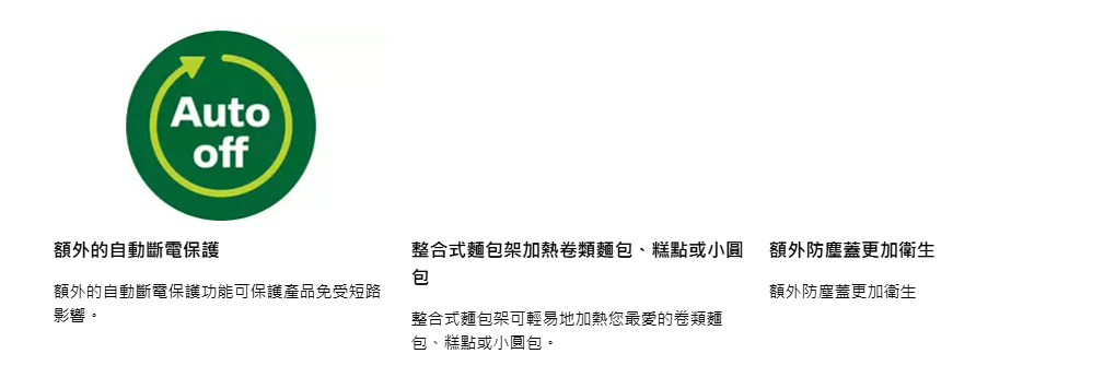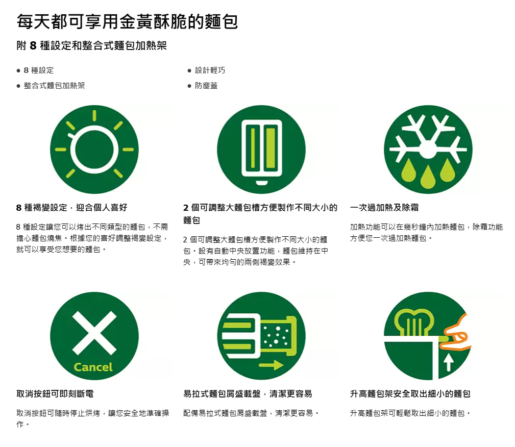 技術規格原產地製造地:中國配件隨附 防塵蓋技術規格電壓 220-240 V電源 830 W頻率 50-60 Hz一般規格褐變程度數目 8產品功能可調校烘焗程度自動斷電功能取消按鈕隔熱外殼解凍功能升高麵包功能電線儲藏格設計和外表顏色 黑色機身物料 塑膠