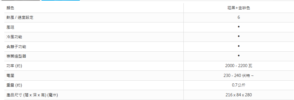 功率:2000-2200瓦3段熱力及2段風速,共6種設定冷風功能,可塑造髮型內置負離子護髮功能可令頭髮柔順閃亮附有速乾風咀,可集中出風,有助迅速吹乾頭髮附有專業造型器,可盈造出自然的曲髮可拆式吸風口蓋,方便清潔
