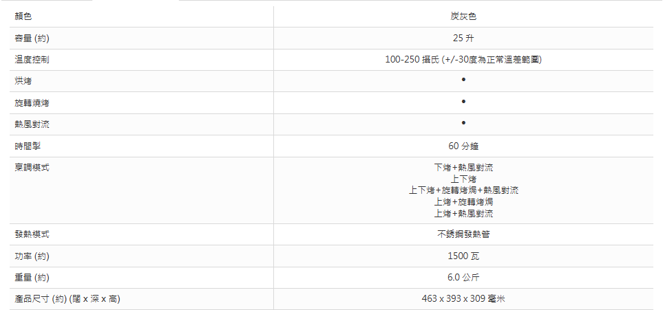 容量 / 烹調火力 : 25 升 / 1,500瓦雙層隔熱強化玻璃門,提升烤焗效能溫度控制 : 攝氏100-250度 (+/-30度為正常溫差範圍)5種功能 : 下烤+熱風對流; 上下烤; 上下烤+旋轉烤焗+熱風對流; 上烤+旋轉烤焗; 上烤+熱風對流304不銹鋼發熱管爐內耐高温照明燈時間掣: 60分鐘配件 : 烤網 / 烤盤 / 烤叉 / 烤叉托架 / 烤盤夾 / 可拆式碎屑盤