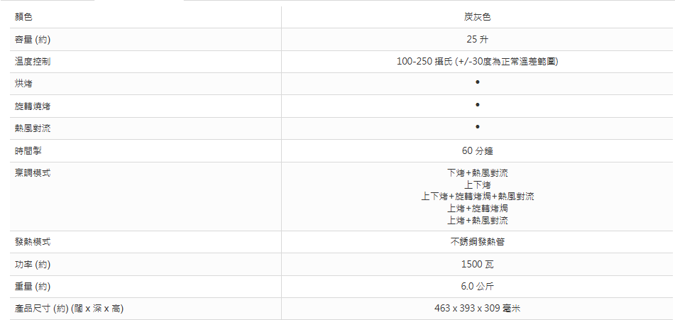 容量 / 烹調火力 : 25 升 / 1,500瓦雙層隔熱強化玻璃門,提升烤焗效能溫度控制 : 攝氏100-250度 (+/-30度為正常溫差範圍)5種功能 : 下烤+熱風對流; 上下烤; 上下烤+旋轉烤焗+熱風對流; 上烤+旋轉烤焗; 上烤+熱風對流304不銹鋼發熱管爐內耐高温照明燈時間掣: 60分鐘配件 : 烤網 / 烤盤 / 烤叉 / 烤叉托架 / 烤盤夾 / 可拆式碎屑盤