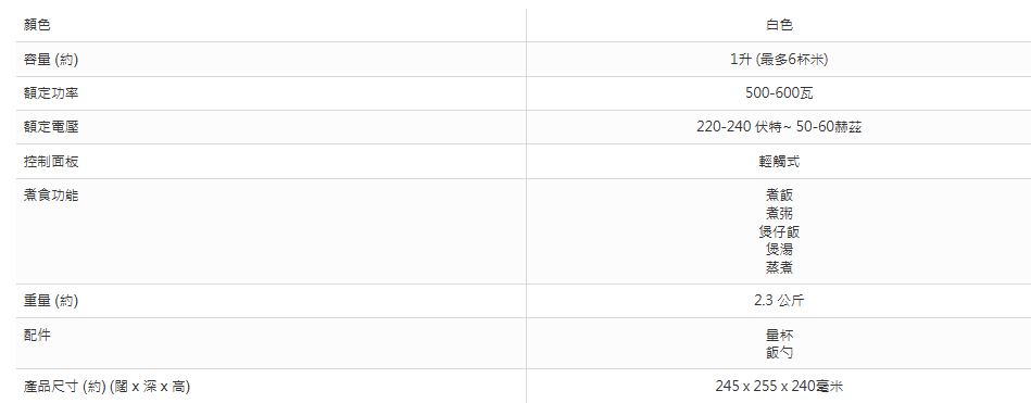容量/功率 : 約1升(最多6杯米) / 500-600瓦 5種煮食功能(包括煮飯、煮粥、煲仔飯、煲湯及蒸煮功能) 可拆式電源線及可水洗內蓋 輕觸按鍵,容易操作 顏色︰ 白色
