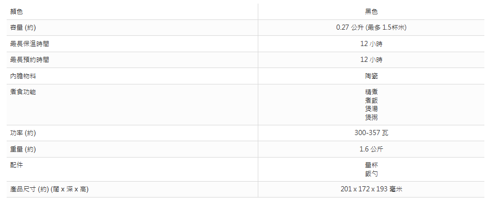 容量:約 0.27 公升 (最多 1.5 杯米)4 種煮食功能 (包括: 精煮、煮飯、煲粥及煲湯)備有保溫及預約功能輕觸式操作,容易使用陶瓷內鍋,成份天然及耐用機身小巧,方便易攜可拆式電源線配件:量杯及飯勺