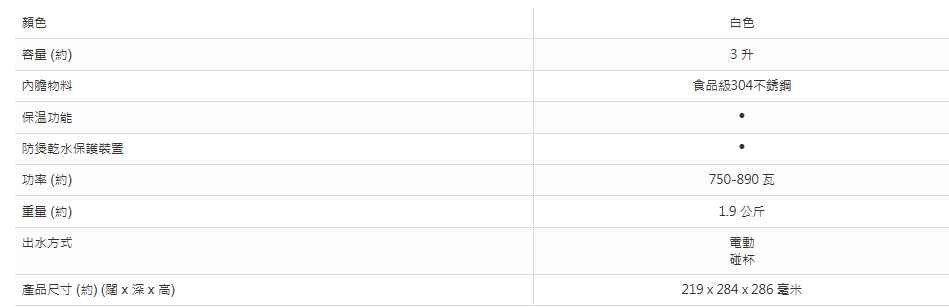 容量 / 功率 : 3升 / 750-890瓦 電動出水 / 碰杯出水 自動保溫功能 食品級304不銹鋼內膽