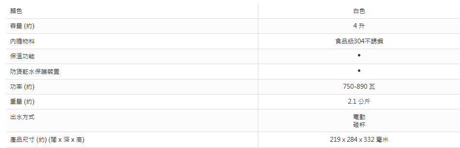 容量 / 功率 : 4升 / 750-890瓦 電動出水 / 碰杯出水 自動保溫功能 食品級304不銹鋼內膽