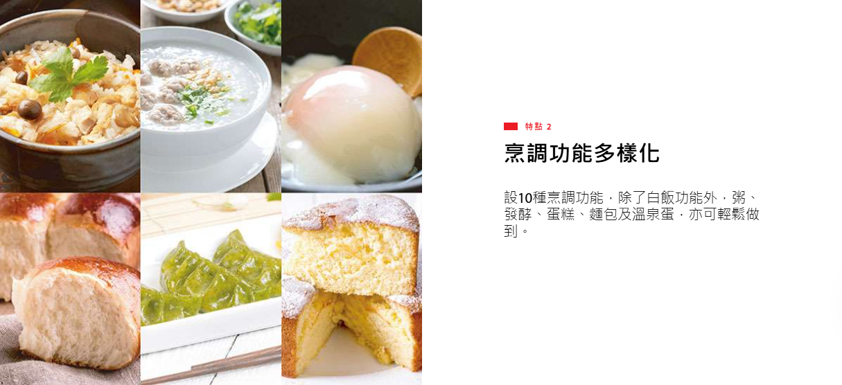 - 備有烹調白飯、混合米飯、煲粥、快速煮飯/蒸煮、發酵、烘焙/煲湯、製作溫泉蛋及翻熱湯水功能