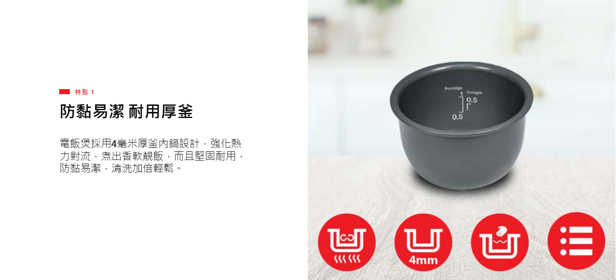 - 防黏易潔內鍋, 厚達4毫米,堅固耐用