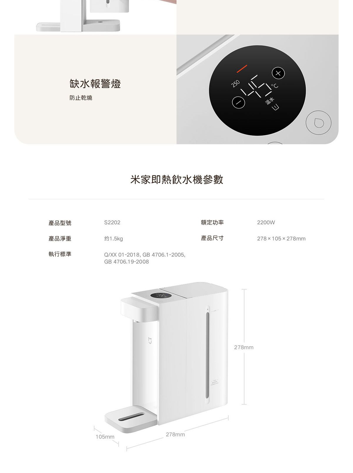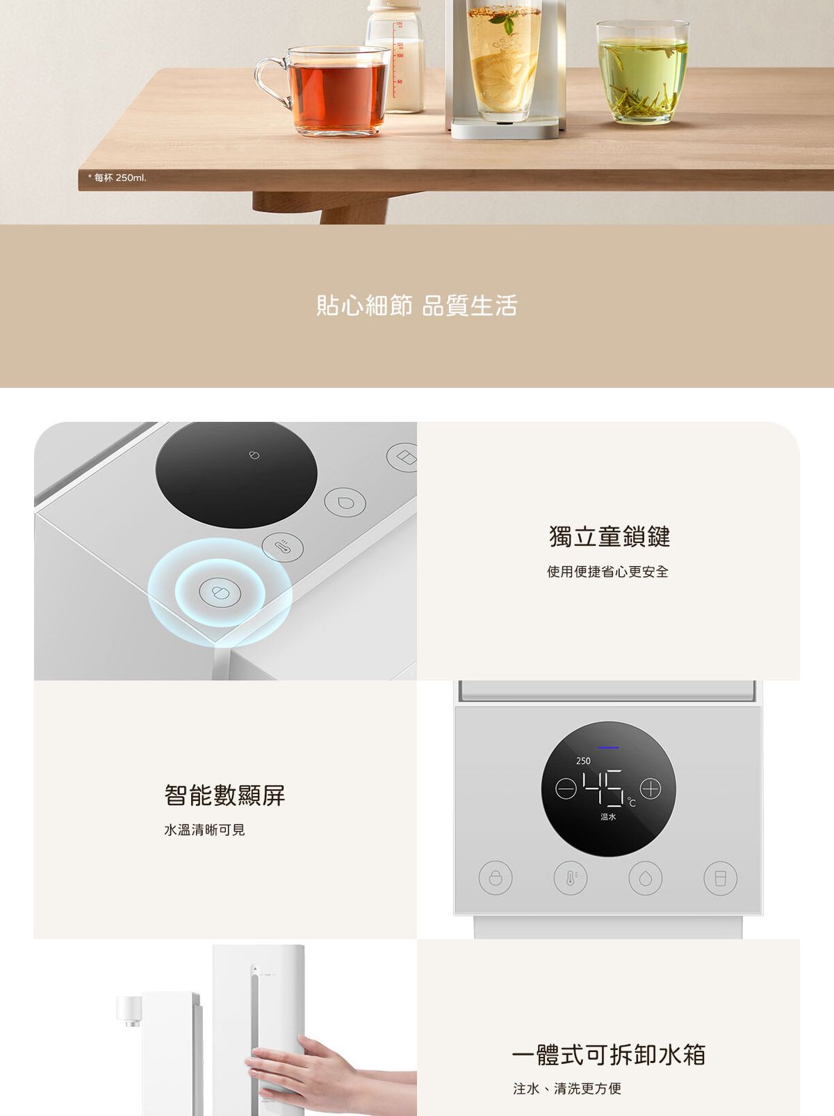 3秒即出熱水 2.5L 水箱 45.3dB 低噪運行 每1℃可調, 沖飲更豐富 智能屏顯,自清潔模式免拆洗更省心 設獨立童鎖鍵 一體式可拆卸水箱 缺水報警燈, 防止乾燒